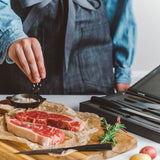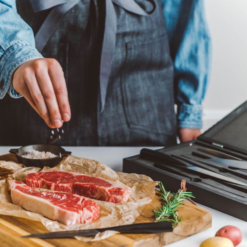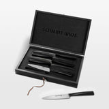 New York designers the Schmidt Brothers envisioned our simply elegant take on classic German cutlery. Height igh-carbon, high-quality German steel is perfectly polished and attached to unpolished steel handles with a contrasting black scorched finish developed at 2750 degrees Fahrenheit. The specially weighted handles and patented Schmidt Brothers curve provide ideal hand position and leverage to control and guide the knife. Steak knife set is nested in a black pine wood box for gift giving or storage.
