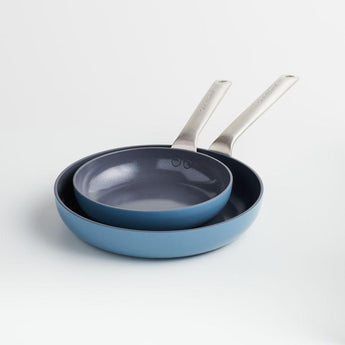 Nuestra exclusiva colección de utensilios de cocina ha sido revisada en cada etapa para brindarle la calidad de reliquia y el aspecto refinado que su cocina merece. Fabricadas en aluminio anodizado duro EvenCook Ceramic™ con tratamiento especial, las sartenes azul denim proporcionan un control uniforme del calor para un rendimiento superior. Ideales para dorar y sellar con menos aceite, las superficies de cocción antiadherentes tienen un revestimiento cerámico con infusión de diamante que libera los alimentos sin esfuerzo y se limpian fácilmente. Las asas ergonómicas con el logotipo de Crate & Barrel estampado son cómodas y equilibradas, y están aseguradas con remaches de perfil liso para una limpieza fácil. Ideales para dorar y sellar, las sartenes de cerámica azul de 8" y 10" del juego también son aptas para horno y asador hasta 260 °C.