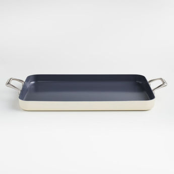 Nuestra exclusiva colección de utensilios de cocina ha sido examinada minuciosamente en cada etapa para brindarle la calidad de reliquia y el aspecto refinado que su cocina merece. Diseñada para abarcar dos quemadores y maximizar el espacio de cocción, nuestra plancha aporta un toque de color a su cocina con su exterior de cerámica color crema, especialmente tratado para una durabilidad excepcional. La superficie de cocción antiadherente cuenta con un revestimiento cerámico con infusión de diamante que libera los alimentos sin esfuerzo y se limpia fácilmente. Ideal para panqueques, hamburguesas y hash, la plancha de cerámica color crema es apta para horno y asador hasta 260 °C.