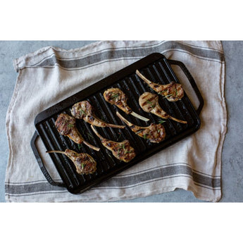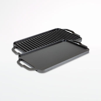 Lodge le da a la clásica plancha de hierro fundido extras inspirados en chefs. Convierte tu cocina en una parrilla de alta eficiencia con esta parrilla reversible que se adapta a dos quemadores para maximizar el espacio de cocción. Plana por un lado y estriada por el otro para sellar con calidad de restaurante, la plancha cuenta con un amplio canal a ambos lados para recoger la grasa y el aceite que se escurre. Su resistente construcción en hierro fundido ofrece una calidad inigualable, así como una excelente retención y distribución del calor, y se puede usar en cocinas de inducción, vitrocerámica, eléctricas y de gas, en el horno, a la parrilla o incluso sobre una fogata. Las asas elevadas proporcionan un agarre ergonómico, y la plancha viene precurada y lista para usar desde el primer momento.