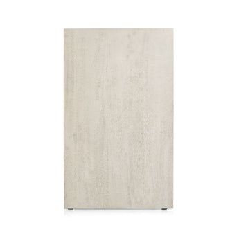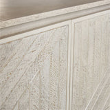 Employing the time-honored technique of parquetry, skilled woodworkers add artisan rusticity to our clean, contemporary Dunewood credenza. Bringing geometric complexity to the credenza's flat-front doors, each piece of mango wood is carefully cut and inlaid by hand to create a modern mosaic of angled lines. A wash of white and a light distressing add a whisper of color and texture to enhance this striking credenza's sculptural presence. Designed by Blake Tovin of Tovin Design, the credenza features an open shelf and two interior shelves.