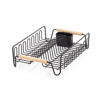 Escurreplatos negro con asas de madera 4,72 altura 20,39 ancho 13,07 profundidad Las medidas están en pulgadas.