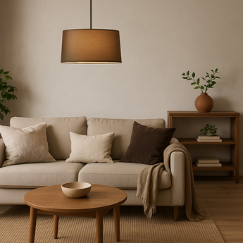 Realza tu espacio con el sofisticado encanto de la lámpara colgante Eclipse. Con una elegante pantalla en forma de tambor envuelta en una tela marrón intenso, esta lámpara colgante ofrece una cálida luz ambiental, perfecta para comedores, salas de estar o entradas. Su diseño minimalista se complementa con una fina barra de suspensión en negro mate, lo que la convierte en una incorporación perfecta tanto para interiores contemporáneos como de transición.