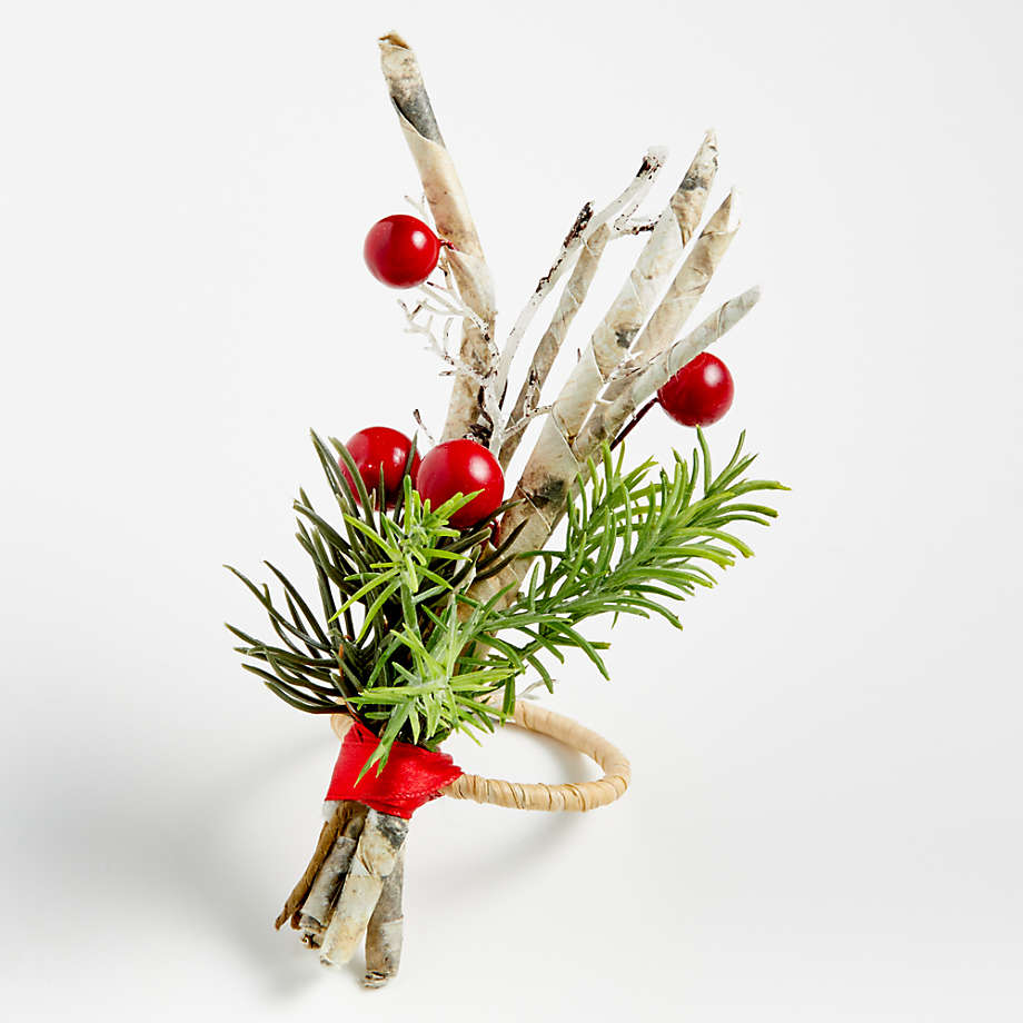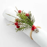 Faux botanicals encircle napkins with the look of fresh pine and red berries. Especially festive with our natural, red or white dinner napkins, the napkin ring provides the perfect accent to the winter or Christmas-themed dining table.