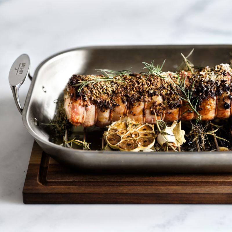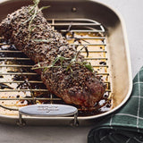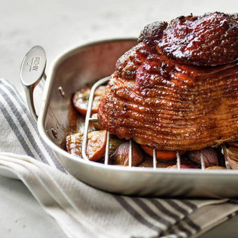 Ase aves, jamón y costillas en esta bandeja premium diseñada con triple capa para una distribución rápida y uniforme del calor. La superficie de cocción y el exterior son de acero inoxidable cepillado para un sellado impecable, mientras que el núcleo de aluminio de gran espesor se calienta rápidamente. Apta para horno a altas temperaturas, la asadera cuenta con asas seguras con doble remache y una rejilla extraíble que permite escurrir la grasa. Simplemente transfiera la bandeja al fuego después de asar para preparar ricas salsas y jugos. Nuestra exclusiva asadera es imprescindible para el anfitrión de las fiestas.