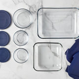Bake, store, reheat and repeat. This versatile storage set goes from oven to freezer to microwave to dishwasher, making batch-cooking a breeze and keeping leftovers ready for the next day's lunch. Topped with ovenproof navy blue lids, the tempered glass containers bake everything from lasagna to brownies to individual pot pies. The glass will not warp, stain or retain odors, and the dishes nest for compact storage. A handy housewarming gift, this 10-piece set includes a 3-quart baking dish with lid, 8-inch square cake pan with lid and 1-, 2- and 4-cup storage containers with lids.