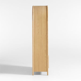 The traditional bookcase takes a contemporary turn in Annie. Made of solid oak and oak veneer with a natural finish, the bookcase showcases a rounded silhouette. Bentwood poles flow a continuous arc from leg to leg, framing open shelves and a storage cabinet with flat-front doors that show off the wood grain. Cleanly integrated into the arcing design, long, rounded pulls open to reveal one adjustable shelf. On its own, the bookcase is a stylish refresh to office, library or living room storage. Or maximize Annie's flowing lines by combining the bookcase with the coordinating media console to create a family-room entertainment center.