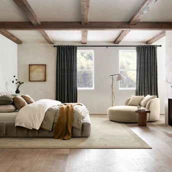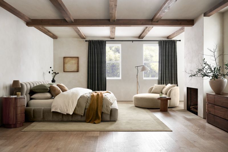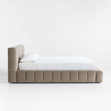 Taking cues from one of our best-selling sofa collections, our Cambria bed brings Italian-style lines and a deeply cushioned frame to the bedroom. Low-lying with a wide profile, the bed features large-scale tufting to modernize the pillowy appeal of the deeply cushioned rail and headboard. Luxe yet durable velvet in taupe adds to the plush indulgence.