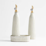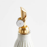 Relaxed ridges and unique speckles refresh the classic cruet set with artisanal charm. The set—two bottles and a caddy tray—is hand finished with a cream-colored reactive glaze that creates unique constellations of tiny flecks. A brass finish on the metal spouts add a dash of glam to Carmel's rustic chic appeal.