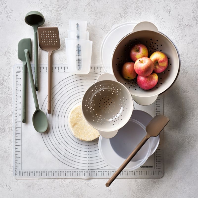 This helpful set stores six kitchen essentials in one neat stack. Crafted of durable melamine in a modern, understated palette, durable melamine bowls and colanders nest compactly. Thoughtfully placed holes ensure the two taupe strainers drain well, while tab handles make it easy to give them a shake. Useful for mixing, marinating, serving and storing, the two white bowls are topped with lids to keep contents fresh. This space-saving set makes a thoughtful graduation or housewarming gift.