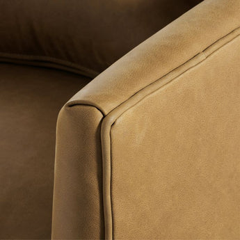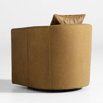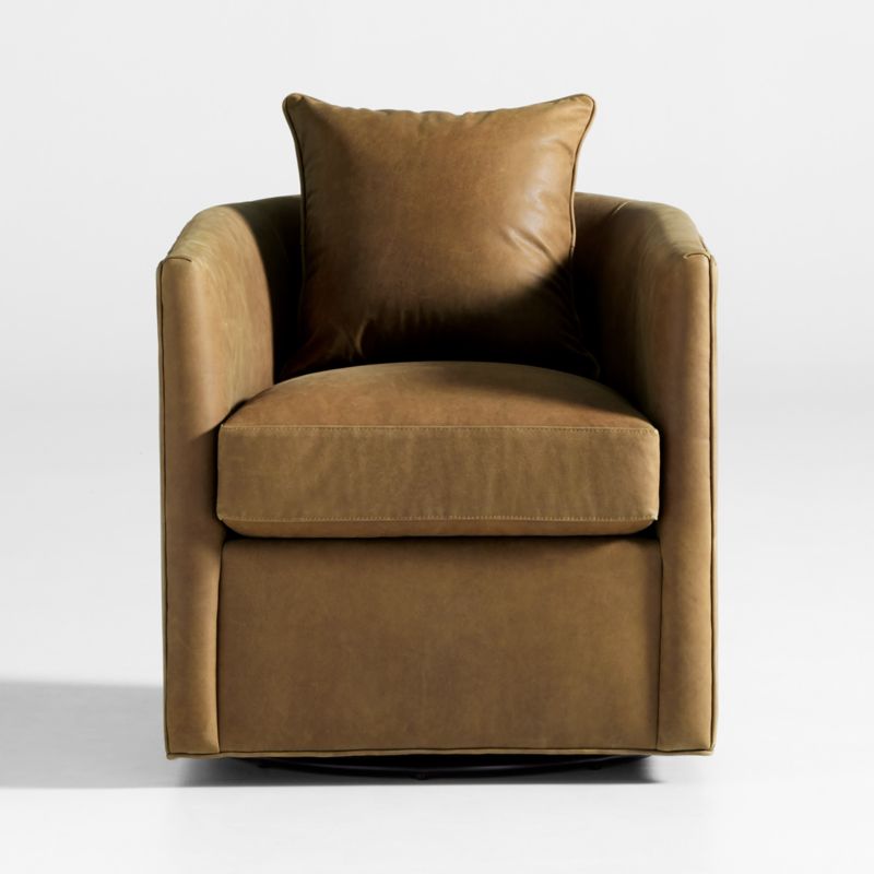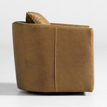 Tailored with easy-to-live-with leather, our Drew swivel chair has all the right moves. Shaped with the embrace of a barrel back, the chair indulges with a cushioned seat and throw pillow. The rustic, distressed leather speaks to life on the range with natural markings and a light coat of wax to lend a smooth hand. Perfectly proportioned for use in pairs, Drew is a great choice for multitasking apartments, media rooms or conversational corners in the living room.