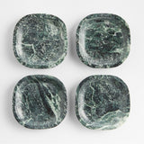 Elevate cocktail hour with these lovely square coasters crafted out of green marble. Each hand-finished coaster in the set of four is one of a kind, showcasing dramatic white veining. A subtle coupe shape gives the coasters a contemporary look while containing condensation to protect table surfaces.