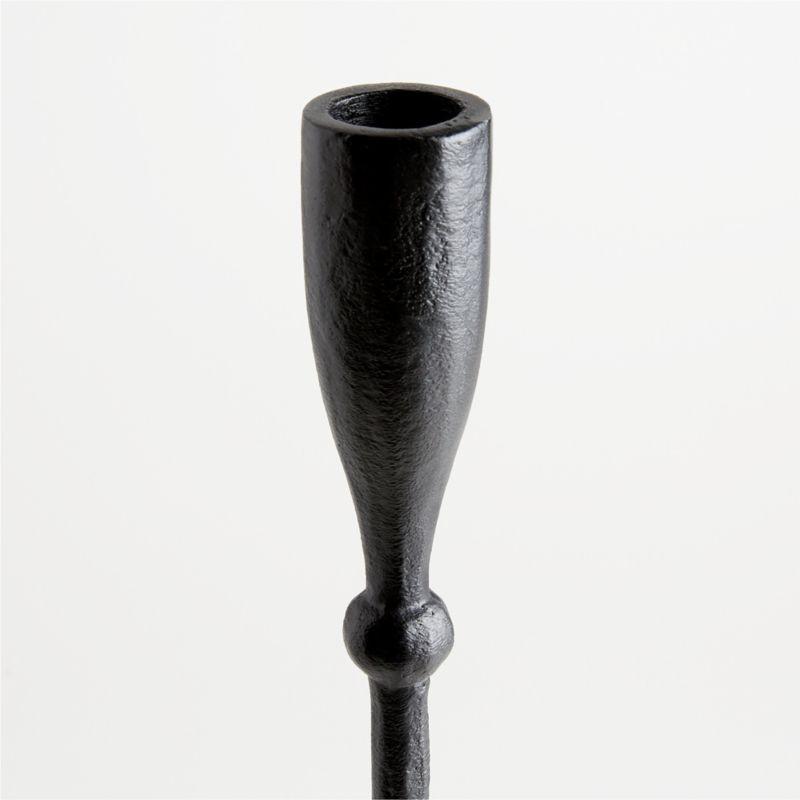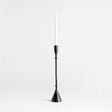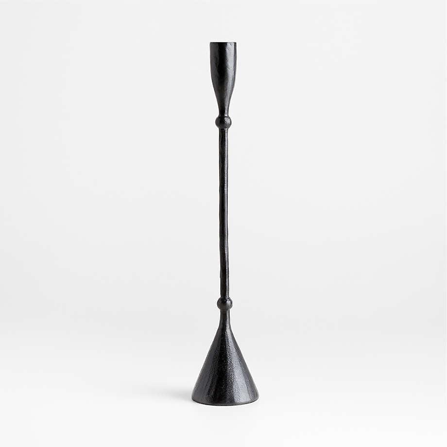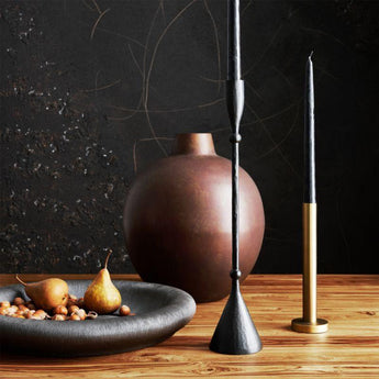 Ferric updates antique cast iron candlesticks with an impeccable blend of modern and vintage style. Dramatically tall and slender, our medium taper holder shapes black-finished metal with rustic geometry and texture. Group multiple heights of candle holders from our Ferric collection for a graceful arrangement on your fireplace mantel, dining table or sideboard.