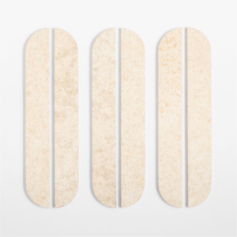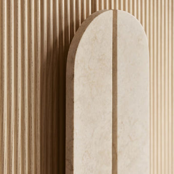Bold-yet-accessible, our Kahn storage cabinet elevates your home decor with its unique blend of natural materials, modern design, and thoughtful functionality. Supported on wide cylindrical legs, the racetrack-shaped cabinet has a striking curved exterior wrapped in solid ash ribbing that's whitewashed for a light and airy look. A rounded slice of cream marble serves as the handle, opening up a well-equipped interior that lets the cabinet perform a variety of functions—from coffee bar to drink station. Storage options abound with two adjustable shelves, a fixed lower shelf, work surface and large curved drawer. Cord-management cutouts at the rear enable seamless integration of coffeemakers, blenders and other small appliances.