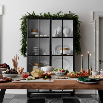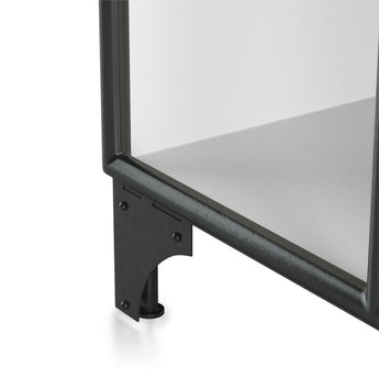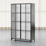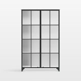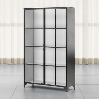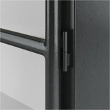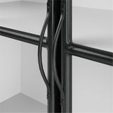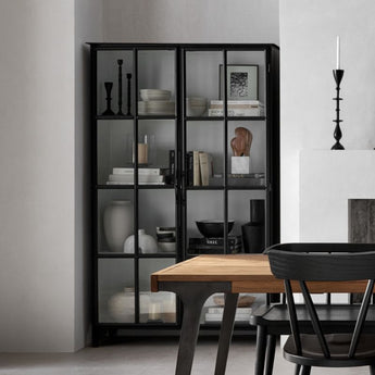 Kedzie channels traditional Japanese design to update traditional cabinetry. A study in contrasts, the black iron with windowpane detail contrasts with the crisp white interior with ample shelving to maximize storage and display options. Slim rope-like handles and rounded, riveted feet nod to tradition with a touch of industrial.
