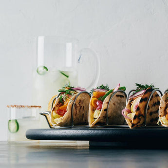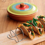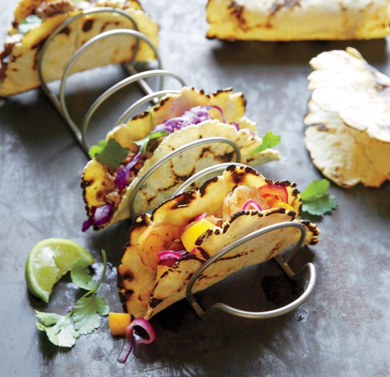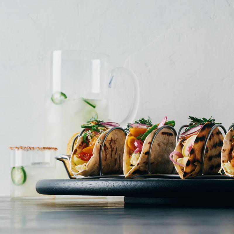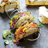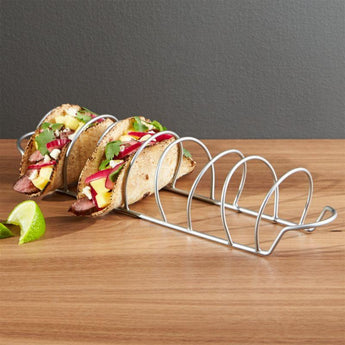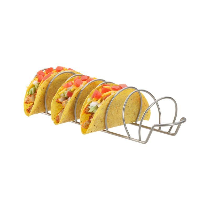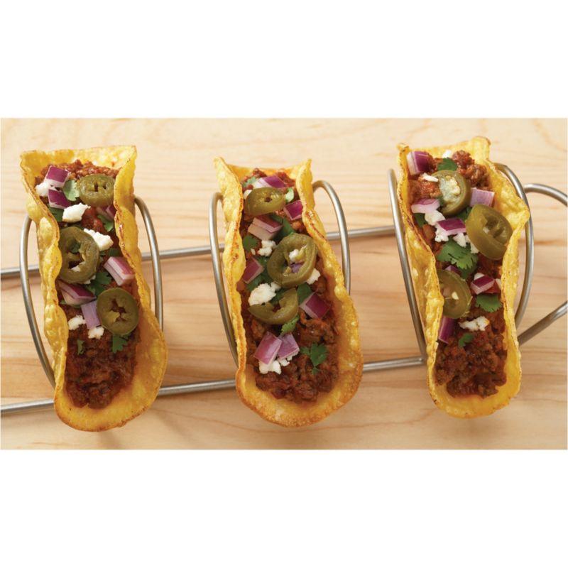 Assemble and serve with this task-specific taco holder designed with the perfect angle to cradle and stuff four taco shells without breaking them or crushing the ingredients.