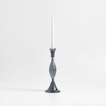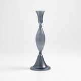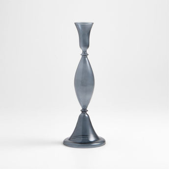 Milano reimagines vintage candlesticks, updating the ornate silhouettes with streamlined curves in indigo glass to stunning effect. Hand-blown by skilled craftspeople, this large, intricately curved candle holder culminates in an elongated cup that supports a taper or doubles as a bud vase. The modern grey-blue tint glows moodily in candlelight. Display the subtly playful piece solo for a sculptural look, or layer with other exclusive Milano glass taper holders in various heights and hues for a more eclectic, extravagant effect.