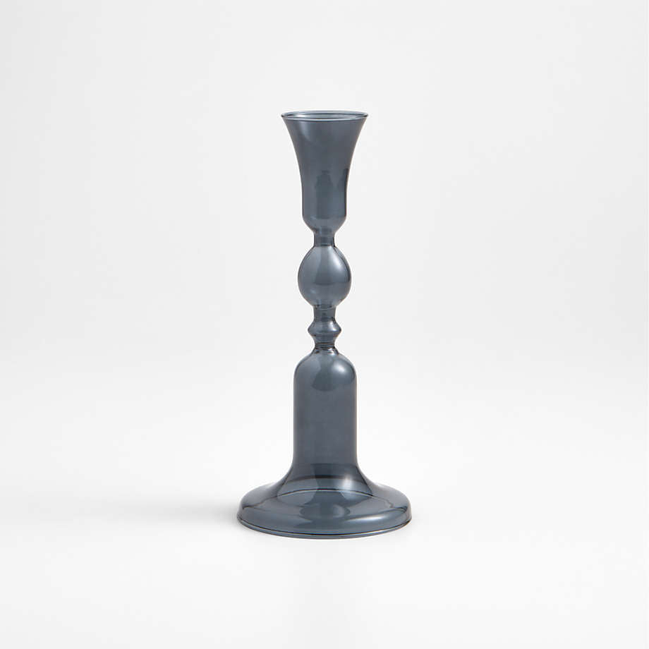 Milano reimagines vintage candlesticks, updating the ornate silhouettes with streamlined curves in indigo glass to stunning effect. Hand-blown by skilled craftspeople, this medium, intricately curved candle holder culminates in an elongated cup that supports a taper or doubles as a bud vase. The modern grey-blue tint glows moodily in candlelight. Display the subtly playful piece solo for a sculptural look, or layer other exclusive Milano glass taper holders in various heights and hues for a more eclectic, extravagant effect.