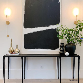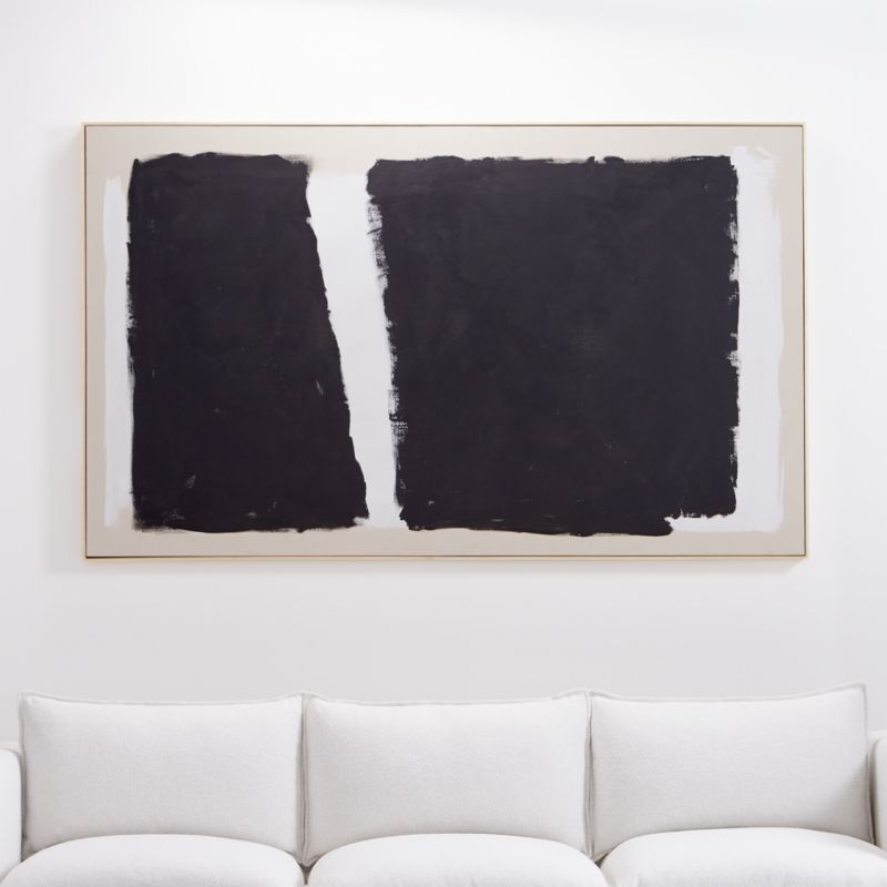 Graphic, impactful and absolutely one of a kind. This abstract artwork explores positive and negative space with boldly painted black shapes on a white field. Each work of art is hand painted on raw canvas and framed in a contemporary floater of blonde wood. Large-scale and dramatic, the painting looks amazing showcased on a prominent wall or stairwell. Due to its handcrafted nature, each painting is unique and will exhibit slight variations.