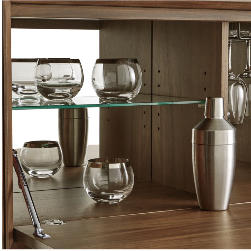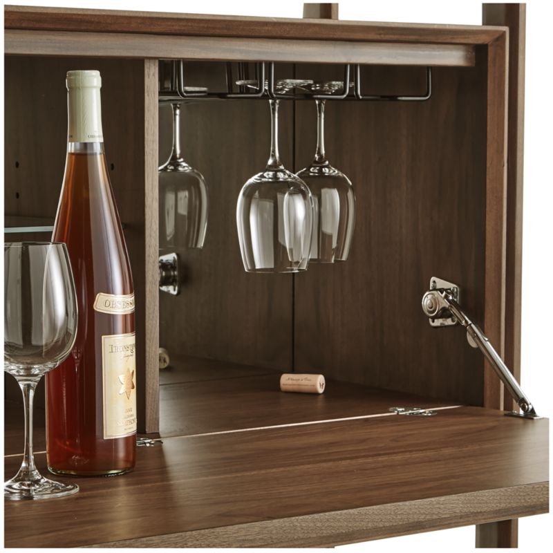 Our popular Tate collection brings its cool, 1960s vibe into the office, family room or library as a modular storage solution with style to spare. Flanked by open shelves, this bookcase bar features a flat-front door that drops down to reveal a rack for wine glasses, glass shelf, handsome mirrored back and plenty of space to store wine bottles and barware. Designed by Blake Tovin, the Tate Bookcase Bar is a Crate and Barrel exclusive.