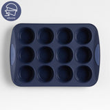 Corn muffins, lemon cupcakes and mini frittatas pop right out of this silicone muffin pan. Crafted of flexible silicone, the pan bakes evenly and releases baked goods perfectly. The integrated steel rim keeps the pan stable as you move it into and out of the oven. Fitted with sturdy handles, this deep blue pan bakes a dozen treats and cleans up easily in the dishwasher.
