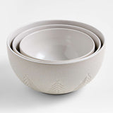 A snowy forest of minimalist evergreens encircles our wintry White Trees mixing bowls. Inspired by artisanal ceramics, the stoneware set is finished in subtly speckled off-white. Matte glaze on the exteriors looks modern, while glossy glaze on the insides stands up to metal whisks and spoons. The carved trees allow the glaze to pool, creating a charming snow-laden look. Use the trio of bowls to mix batches of cake batter, buttercream and cookie dough or to serve a trio of holiday side dishes.