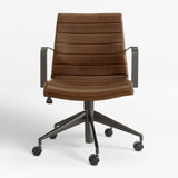 Nuestra silla de oficina Graham destaca por su estilo moderno con un perfil estilizado y piel sintética a medida en un cálido color marrón. Su elegante tapizado con costuras acanaladas se complementa con elegantes brazos en tono bronce y una base cónica que le confieren un asiento firme y un toque arquitectónico. ^ Diseñada por Daniel Stromborg de The Common Good, Graham es un clásico para cualquier oficina en casa. La silla de escritorio Graham es exclusiva de Crate and Barrel.