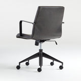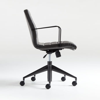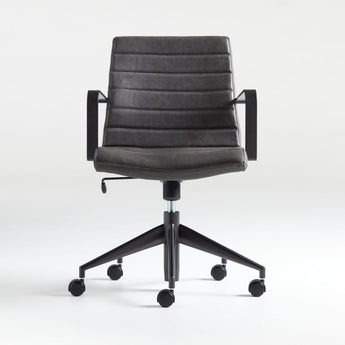 Our Graham office chair scores modern style points with a streamlined profile and tailored faux leather in grey. Handsome, channel-seamed upholstery is complemented by sleek gunmetal arms and tapered base to shape a supportive seat and give the chair its architectural flair. Designed by Daniel Stromborg of The Common Good, Graham is a classic for any home office. The Graham Brown Leather Desk Chair is a Crate and Barrel exclusive.