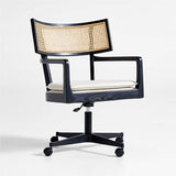 Based on our popular Libby accent chair, this desk chair introduces of-the-moment caning to the home office. Solid nettlewood with a black ebonized finish shapes the chair's clean lines and crisp angles, framing a textural inlay of natural cane on the gently curved back. A slim cushion finished in high-performance linen-blend fabric adds comfort while maintaining the chair's sharp look. Set on a chrome-finished frame, the chair moves about the room on casters and easily adjusts for height.