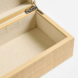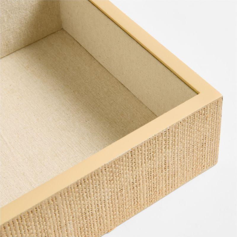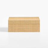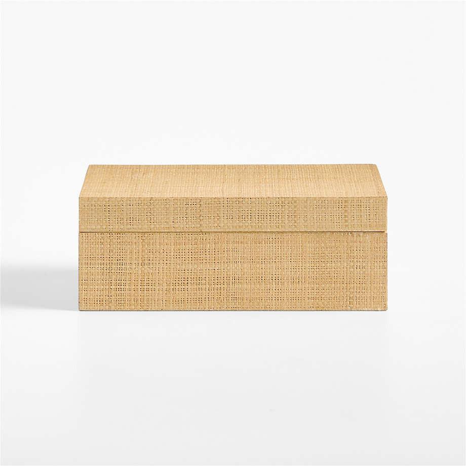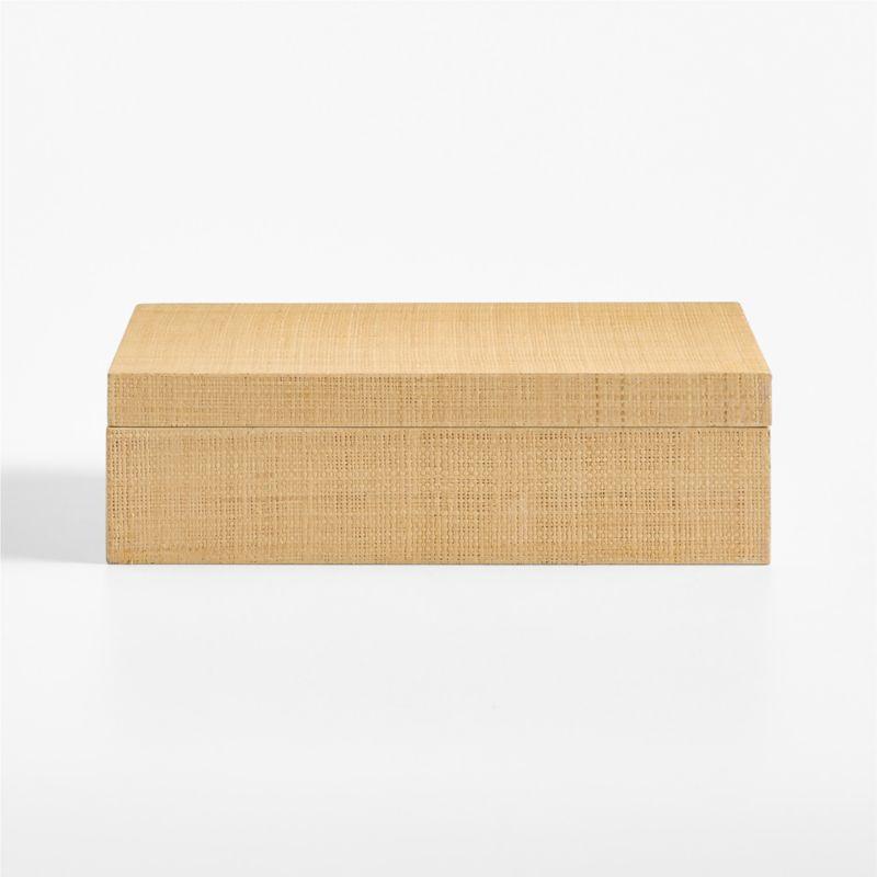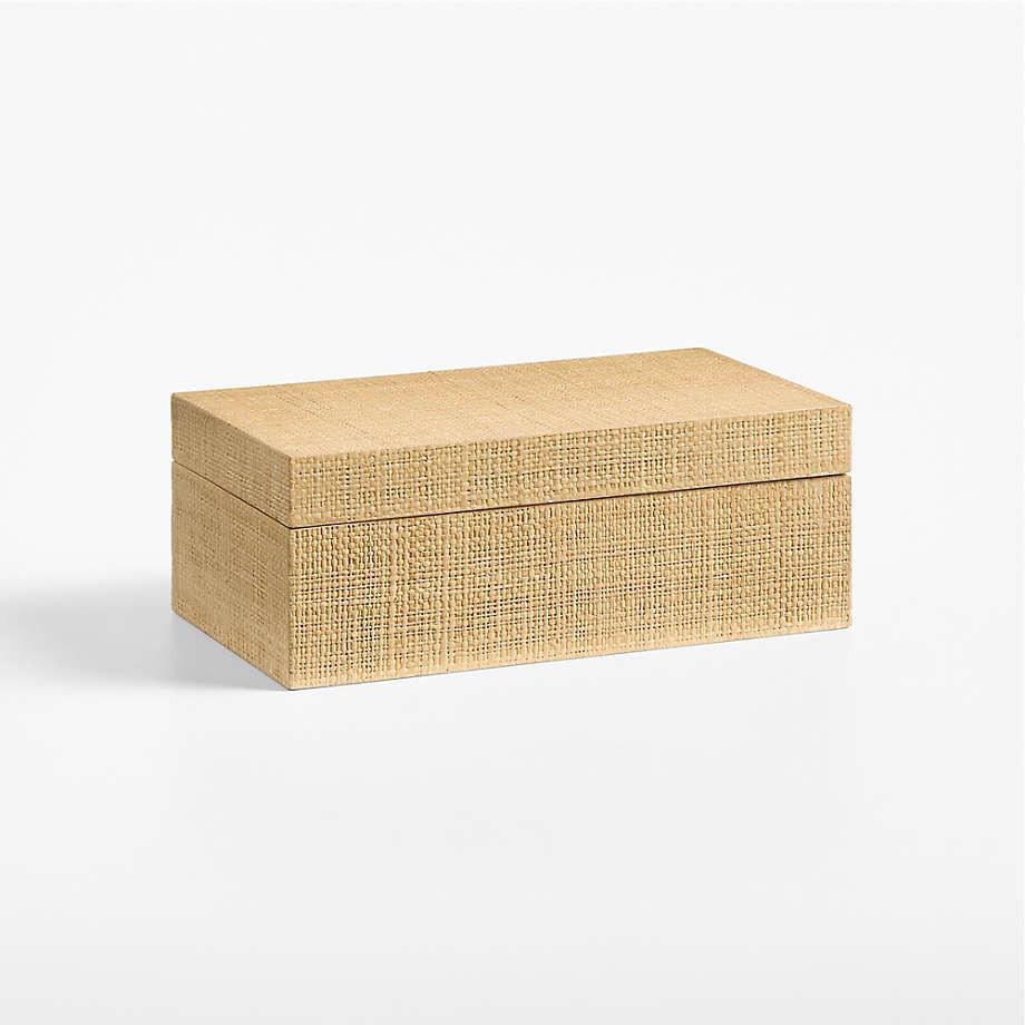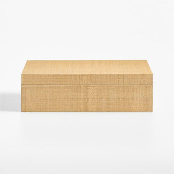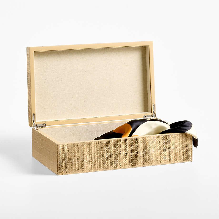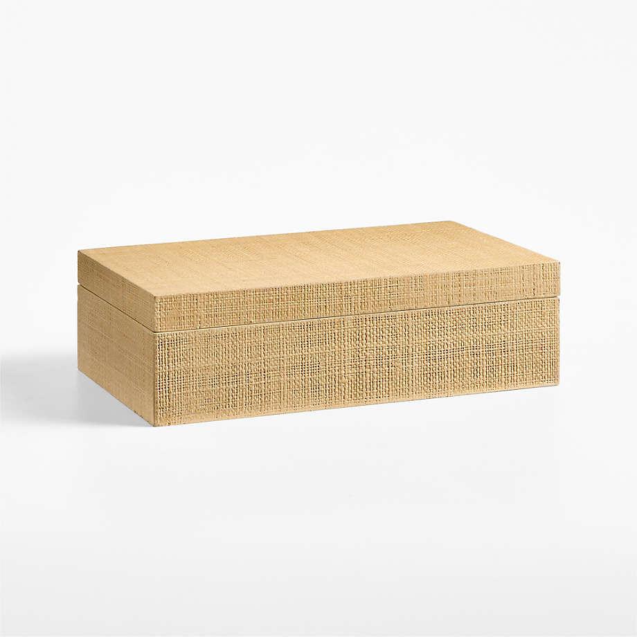 Our coastal chic Palmer collection keeps essentials organized while maintaining a laid-back, breezy look. Painted by hand before being wrapped entirely in raffiathe fiber of the raffia palm tree this hinged box has a refined look in a warm, sandy hue. The tonal linen-lined interior cradles remote controls on the coffee table, sunglasses on the entryway console, or love letters on the dresser. Pair the large wooden box with the other Palmer storage pieces for organization with seaside style.