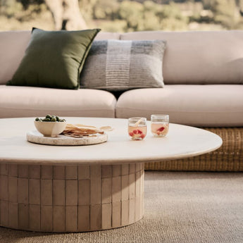 Inspirada en las viviendas costeras de piedra y yeso mineral, nuestra mesa de centro Ipanema renueva los espacios exteriores con un aire global y una mezcla de texturas naturales. Diseñada con sutiles variaciones, la base baja del pedestal se realza con azulejos de resina. El tablero redondo está hecho de una resistente mezcla de fibra y cemento, con un acabado artesanal que imita la piedra. Combine la mesa de centro con los asientos Ipanema para crear un espacio al aire libre de estilo artesanal.