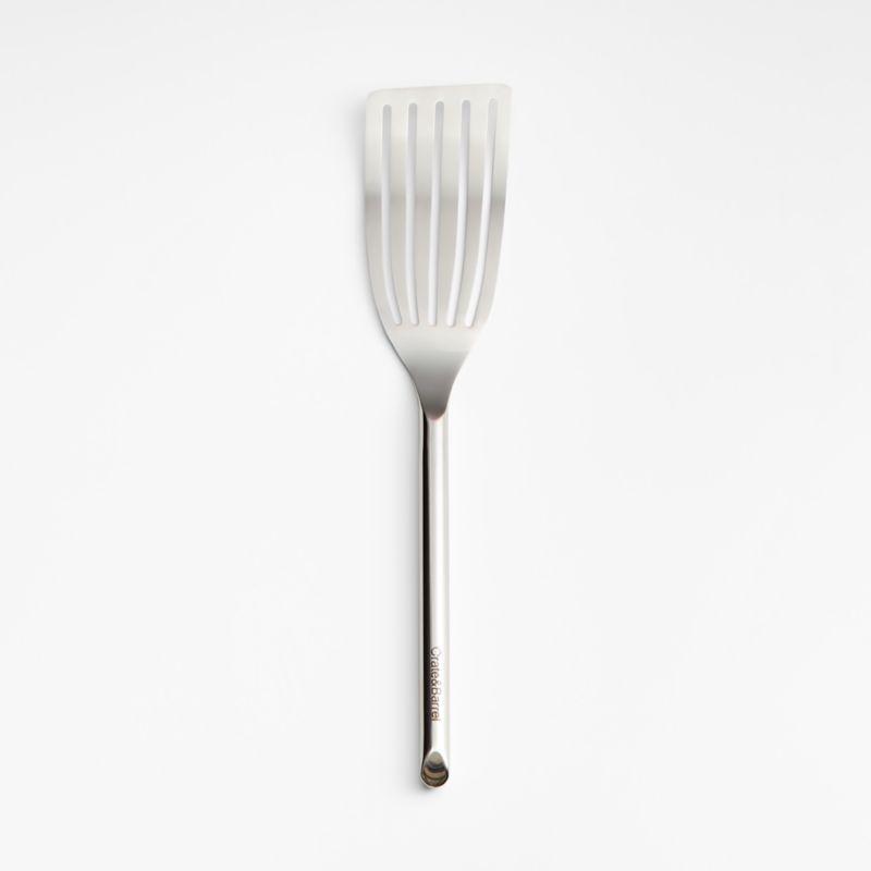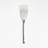 Flip and serve salmon fillets, whole sea bass and crab cakes with our signature stainless steel fish turner. With a flexible head that makes it ideal for handling delicate fish, the utensil also ably turns and lifts a roasted trout, hearty potato pancake or fried egg. The slender slots allow liquids to drain away. Polished stainless steel shapes a sleek spatula with a cylindrical handle for a sturdy grip and a professional look. We love the way the refined beveled edge finishes the elongated handle with a dynamic detail. Combine the dishwasher-safe turner with the other exquisitely proportioned utensils in our exclusive Crate & Barrel collection for a well-outfitted workspace that's up to any cooking challenge.