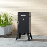 Ahumar es fácil. Este atractivo ahumador eléctrico negro es ideal para cocineros entusiastas que se sienten intimidados por el ahumado o prefieren el carbón. Simplemente agregue astillas de madera y agua a las bandejas designadas, conecte el ahumador y listo. El elemento calefactor eléctrico ofrece un rango de temperatura de 38 °C a 200 °C, el controlador de calor permite ajustar con precisión la temperatura de cocción y el termómetro integrado permite monitorear el calor. Tres rejillas extragrandes cromadas ofrecen suficiente espacio para cocinar grandes cantidades de carne, aves, verduras y frutas.