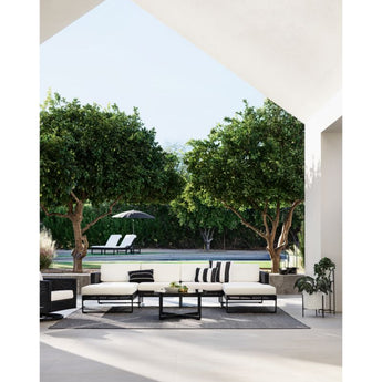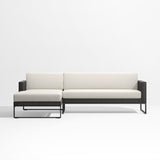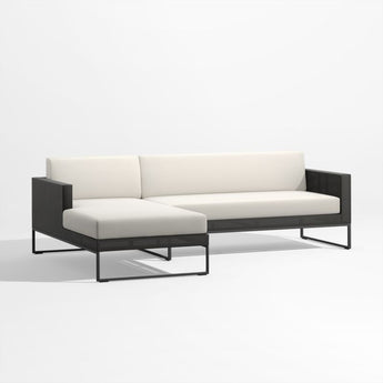 Nuestro sofá modular de exterior Dune, de estilo urbano, es la pieza central de un espacio interior verdaderamente moderno con un toque de exterior. Este sofá modular de dos piezas, lo último en sala de estar, combina una chaise longue con un loveseat con brazo derecho. Las elegantes estructuras lineales están fabricadas con aluminio de grado exterior, revestidas con malla sintética negra resistente a la decoloración, el moho, las roturas y las manchas. Los cojines a medida contrastan con el acrílico blanco resistente a la intemperie. El sofá modular de exterior Dune negro con cojines blancos es una exclusiva de Crate & Barrel.