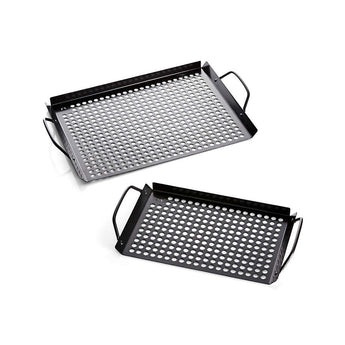 Evite que los alimentos se caigan por las rejillas con este juego de parrillas, perfecto para cocinar pescados delicados, cortes pequeños de carne y verduras. Este juego incluye una parrilla de 18 x 28 cm y otra de 28 x 35 cm, cada una con revestimiento antiadherente.