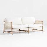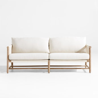 Tan fresco y costero como la brisa del mar, Fen aporta un estilo natural a los momentos de relax al aire libre. Las clavijas redondas de teca natural conforman la estructura de líneas limpias del sofá, realzada con un cepillado de alambre y un cálido acabado ceruse. Cada estructura está forrada a mano individualmente por artesanos expertos con un cordón apto para exteriores que se ve y se siente como una cuerda natural. Añadiendo una textura llamativa y un complemento tonal, el cordón color marfil envuelve llamativos acentos lineales en los brazos y una base de tejido de estera para el cojín del asiento del banco y los respaldos de las almohadas, cubiertos con una tela color hueso apta para exteriores. Diseñado con un asiento de firmeza media y un respaldo suave, este sofá de exterior se adapta perfectamente tanto a entornos informales como formales.