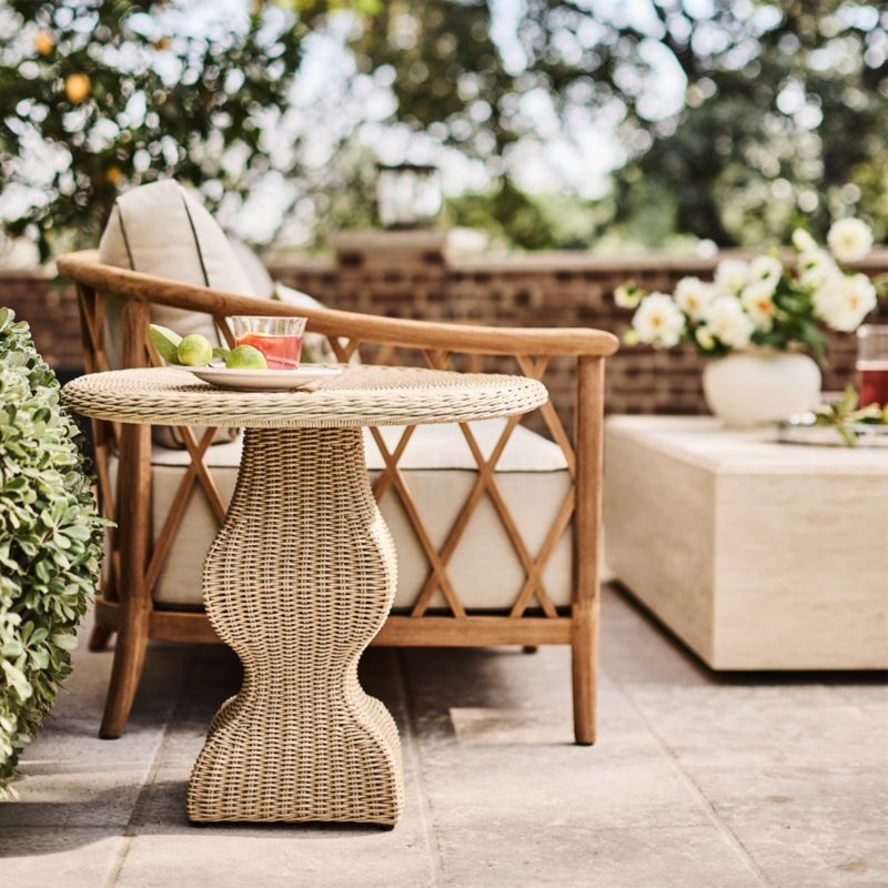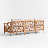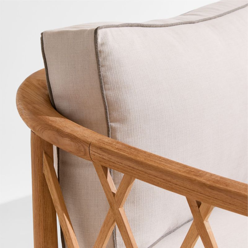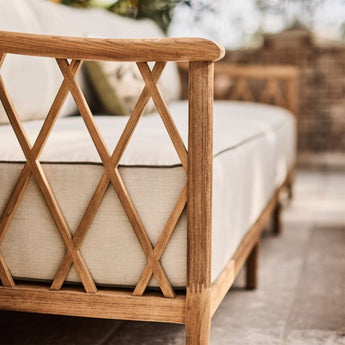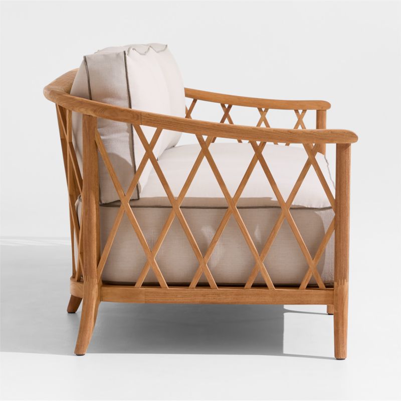 Recalling vintage European garden furniture, the Harper sofa refines outdoor lounging with high style and extra-deep, sink-in cushions. The sustainable teak frame stands on gracefully flared legs as it shapes a curved back detailed with a breezy, trellis-inspired lattice pattern. The thick bench cushion provides a slightly firm, supportive seat with soft, fiber-filled back box cushions for added comfort. Bordered with contrast welting in taupe, the well-tailored cushions feature natural-toned performance fabric woven with a slight slub for a touch of texture.