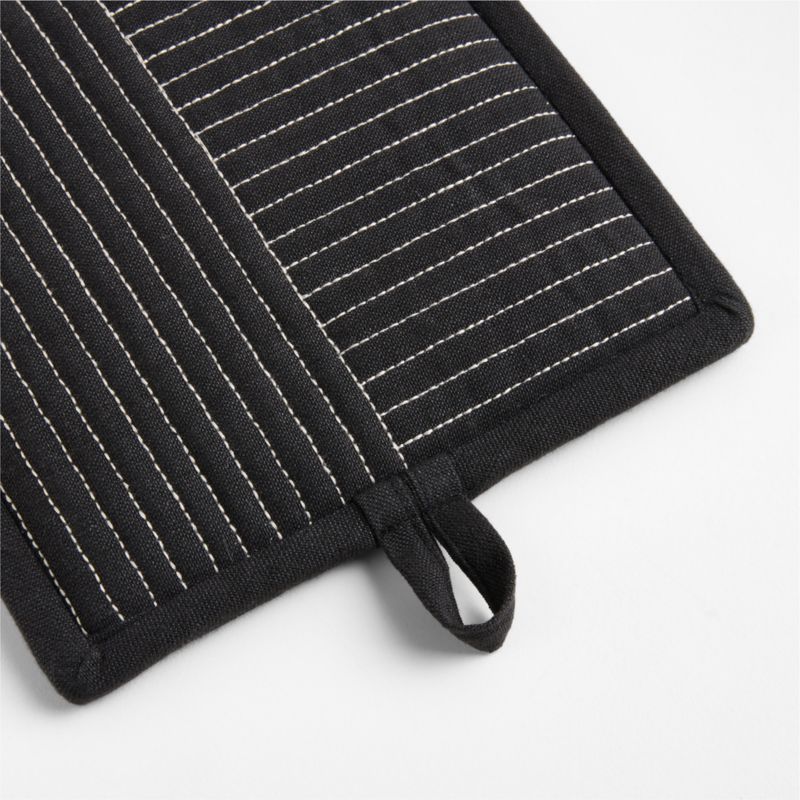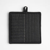 Inspired by our wood and ceramic Hanno collection, this pot holder exhibits the same dynamic combination of horizontal and vertical stripes. Slender embroidered stripes stitched in a classic kitchen palette of white on black give the pad multidirectional linear interest. Protecting hands from hot pans and bakers, the linen-organic cotton pot holder pairs with the matching oven mitt for coordinated cooking, baking and serving.