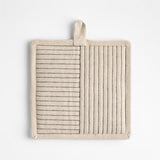 Inspirado en nuestra colección Hanno de madera y cerámica, este agarrador presenta la misma dinámica combinación de rayas horizontales y verticales. Las finas rayas bordadas en negro sobre lino natural y algodón orgánico le confieren un toque lineal multidireccional. Protege las manos de sartenes y panaderos calientes, y se combina con la manopla de horno a juego para cocinar, hornear y servir de forma coordinada.