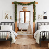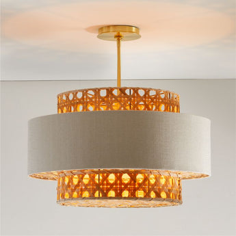Con una llamativa estructura de ratán natural y una pantalla de lino en tonos neutros, además de una brillante varilla y base de latón, nuestra lámpara colgante Reese es una pieza vanguardista y llamativa. Elegante para la habitación de un bebé, espacios familiares compartidos o habitaciones infantiles con estilo, esta lámpara de materiales mixtos presenta una forma de tambor tejido rodeado por una singular pantalla redondeada. Su diseño discreto queda especialmente bien en dormitorios con literas o camas altas. Su intrincado tejido enrejado aporta la calidez, la textura y la belleza de los materiales naturales, mientras que la suave y relajante tela de lino natural y los brillantes detalles de latón contrastan magníficamente.