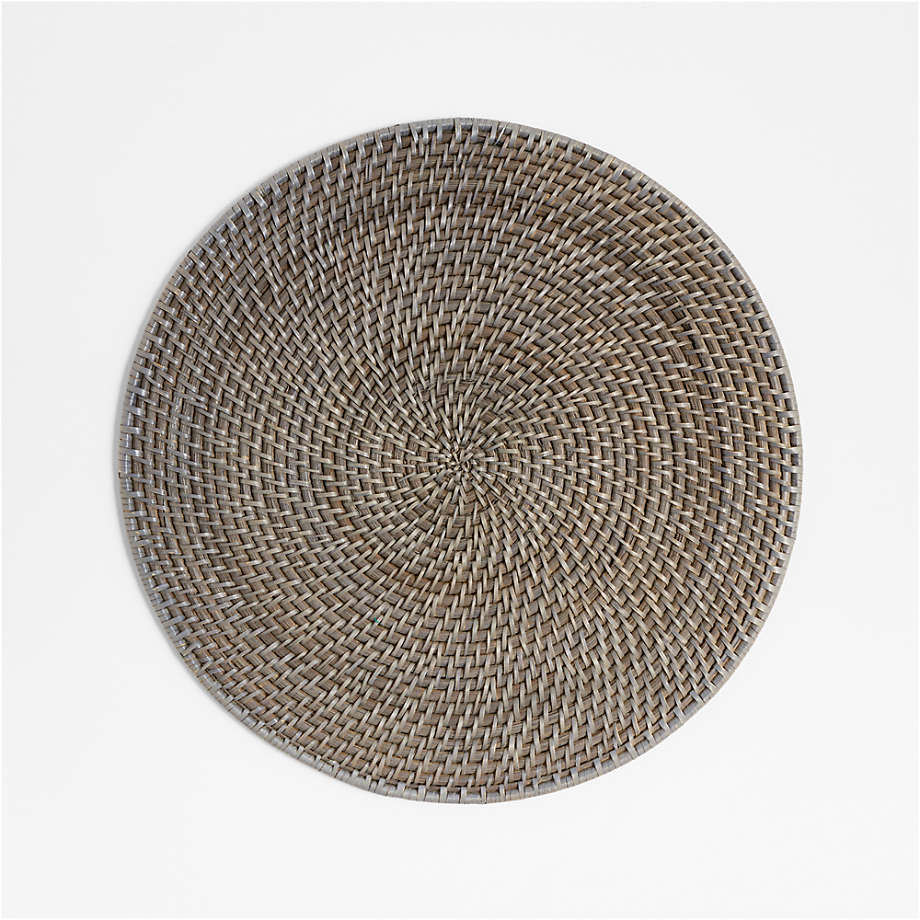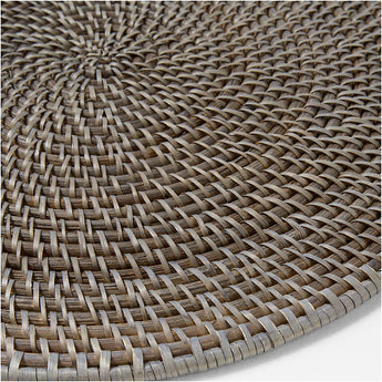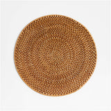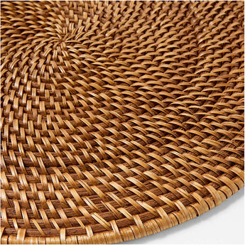 Mantel individual redondo de ratán color miel de Artesia. Diámetro de 14 Las medidas están en pulgadas.