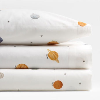Want to get kids excited about bedtime? Layer their bed with playful sheets that embrace what they love. The fun, colorful illustrations of our Outer Space Toddler Sheet Set bring our solar system to life for little explorers, while the crisp, soft organic cotton percale keeps them comfy and cool. Complete the bed with our coordinating Outer Space Organic Cotton Baby Quilt for a look that's out of this world.
