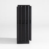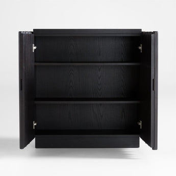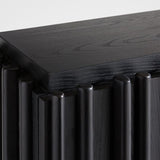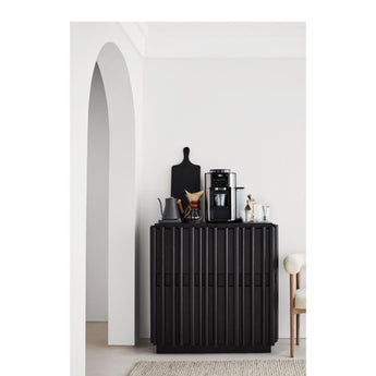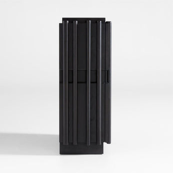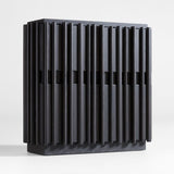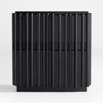 Diseñado con una escultura vintage de teca en mente, nuestro gabinete Bardi deleita la vista con su expresiva textura y líneas arquitectónicas. Varillas de fresno macizo de diferentes formas y grosores lo envuelven, creando una estética escultural y uniforme, realzada por su acabado ebonizado oscuro. Dos puertas se abren para revelar un espacioso interior con dos estantes ajustables. Elegante y moderno, Bardi se convierte en el centro de atención como una llamativa pieza de entrada o como mueble bar.