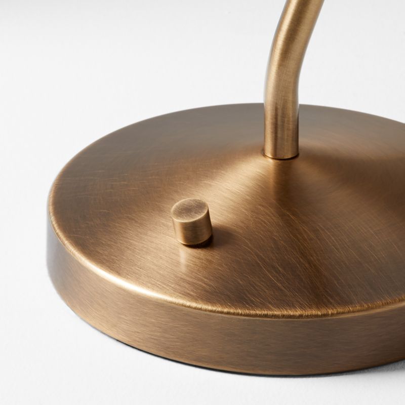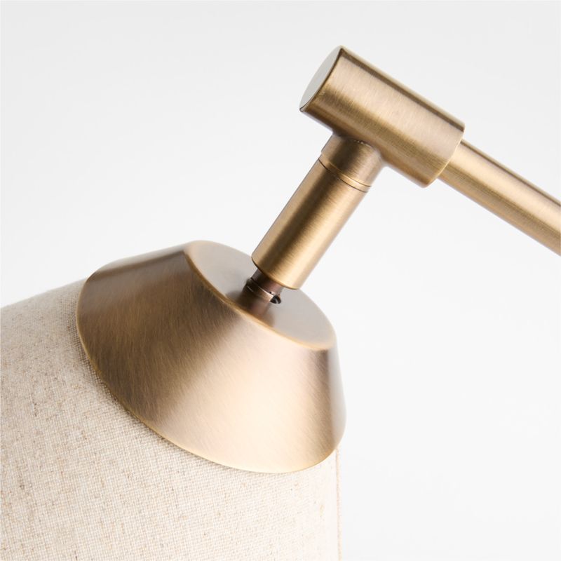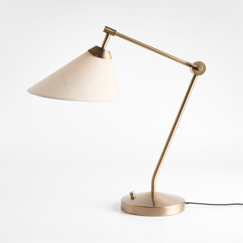Add grace and focused illumination to your space with this task lamp inspired by the clean lines and pure geometry of Japanese design. Supported on a shallow cone, the Avant lamp angles two slender rods to suspend a tapered shade with an elongated, conical profile. Finished by hand in warm burnished brass, the metal base gleams in the warm glow filtered by the natural linen shade. Angle the adjustable lamp so it casts light exactly where it's neededthe knob locks the articulating arm into place.