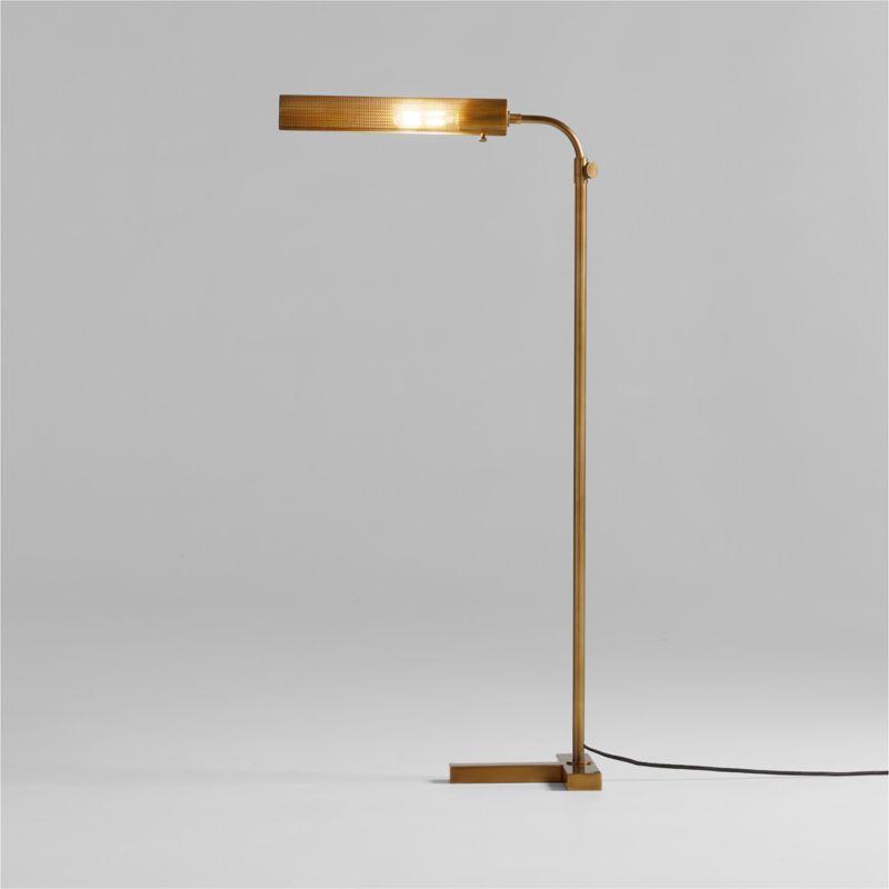Pharmacy-style lighting scales up to living room size in Fleming. Made of steel finished in antique brass, the lamp stems from a sturdy T-shaped base before curving to a lean cylindrical shade. Like its desktop inspiration, the floor lamp casts a directed glow, adjusting in height for more diffused or focused illumination. Clean and classic, the Fleming adjustable floor lamp is a Crate & Barrel exclusive.