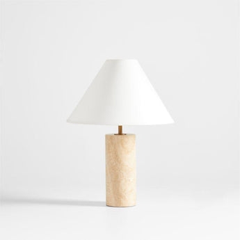Striking in its simplicity, our Navagio lights up an end table or credenza with the allure of travertine. Shaped into a cylinder, the base displays the earthy tones and weathered texture of this treasured form of limestone. An ivory taper shade provides a glimpse of the brass-finished fittings while casting a warm glow. The Navagio travertine table lamp is a Crate & Barrel exclusive.