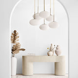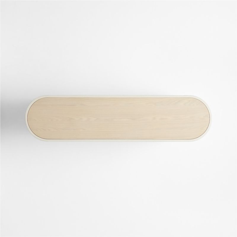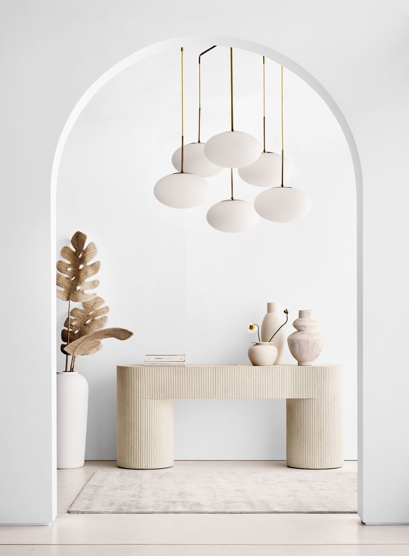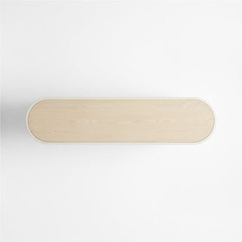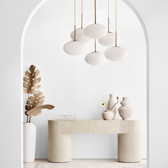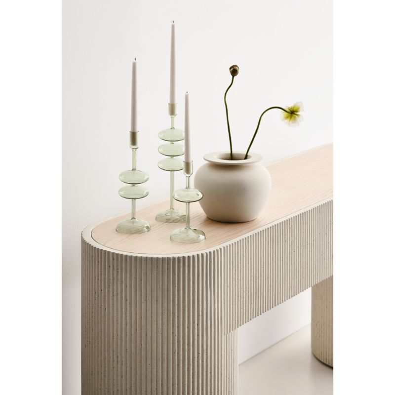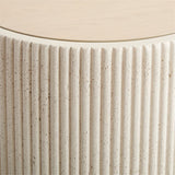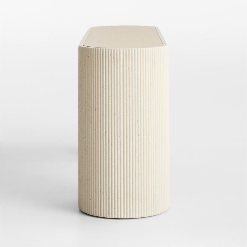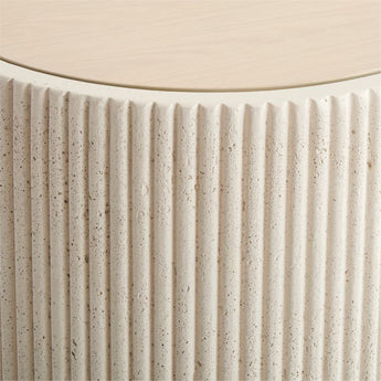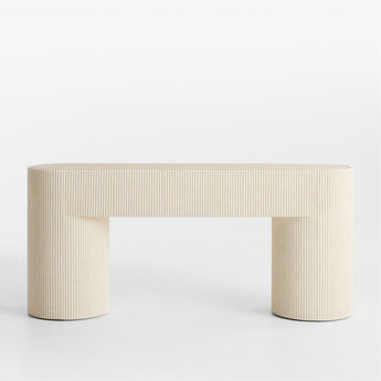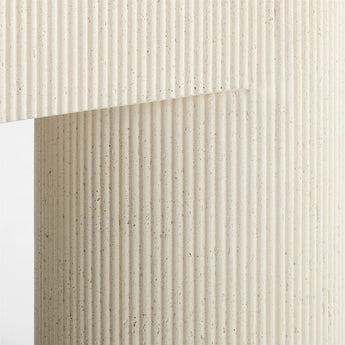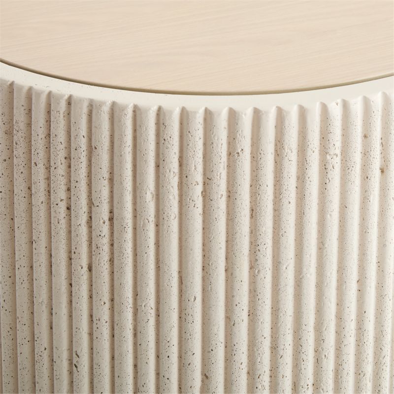 Our statement-making Kahn console table livens up your living space with its chic-meets-industrial design. Taking a stance on pronounced cylindrical legs with racetrack curves, the table showcases the textured and pitted character of off-white concrete cast with a ribbed pattern to make an intriguing play of light and shadow. The inset wood top has a light finish that complements the natural wood grain for the perfect mix of materials.