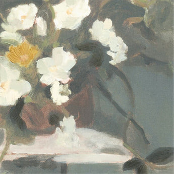 Artist Sadie Bryon brings her experience as both a sculptor and a floral designer to this delightful still life. Simplified shapes, expressive brushwork and an up-close vantage point underscore the lush forms and vibrancy of a vase brimming with foliage and flowers in full bloom Originally painted in oils, this charming still life is reproduced as a giclee print and presented in a wood frame finished with silver leaf.