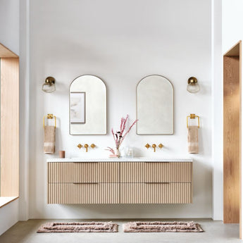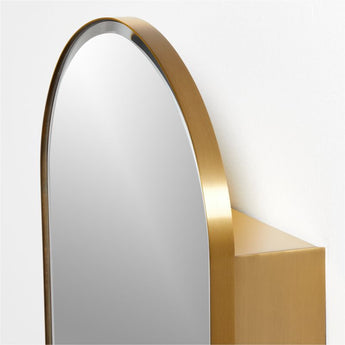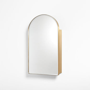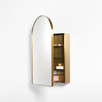 Edged with a slim brass band, our mirrored cabinet curves a subtle arch of modern elegance. Made of brass-finished stainless steel, the clean-lined medicine cabinet provides a mirrored glass door that opens to three shelves. Able to be recess mounted or affixed to the wall, our exclusive Edge brass medicine cabinet complements bathrooms with its contemporary, minimalist style.