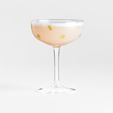 Etched gold stars shimmer and shine on this hand-blown classic coupe glass. The gracefully rounded bowl and tapered stem make the coupe a perfect serving vessel for champagne or holiday cocktails. Perfect for winter-themed gatherings or a sparkling New Year's Eve celebration, this glass adds a touch of seasonal elegance whenever you use it.